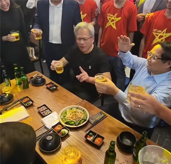 Sau đó, Thủ tướng và ông Huang cùng nhau tham quan khu phố cổ, trò chuyện thân mật với người dân địa phương và du khách, ghé thăm các hiệu sách và cửa hàng lưu niệm. Trong không khí chân thành và ấm áp giữa tiết trời Hà Nội hơi se lạnh, Thủ tướng đã mời vị CEO NVIDIA thưởng thức ẩm thực đường phố Hà Nội như nem rán, nem chua rán và bia Hà Nội.