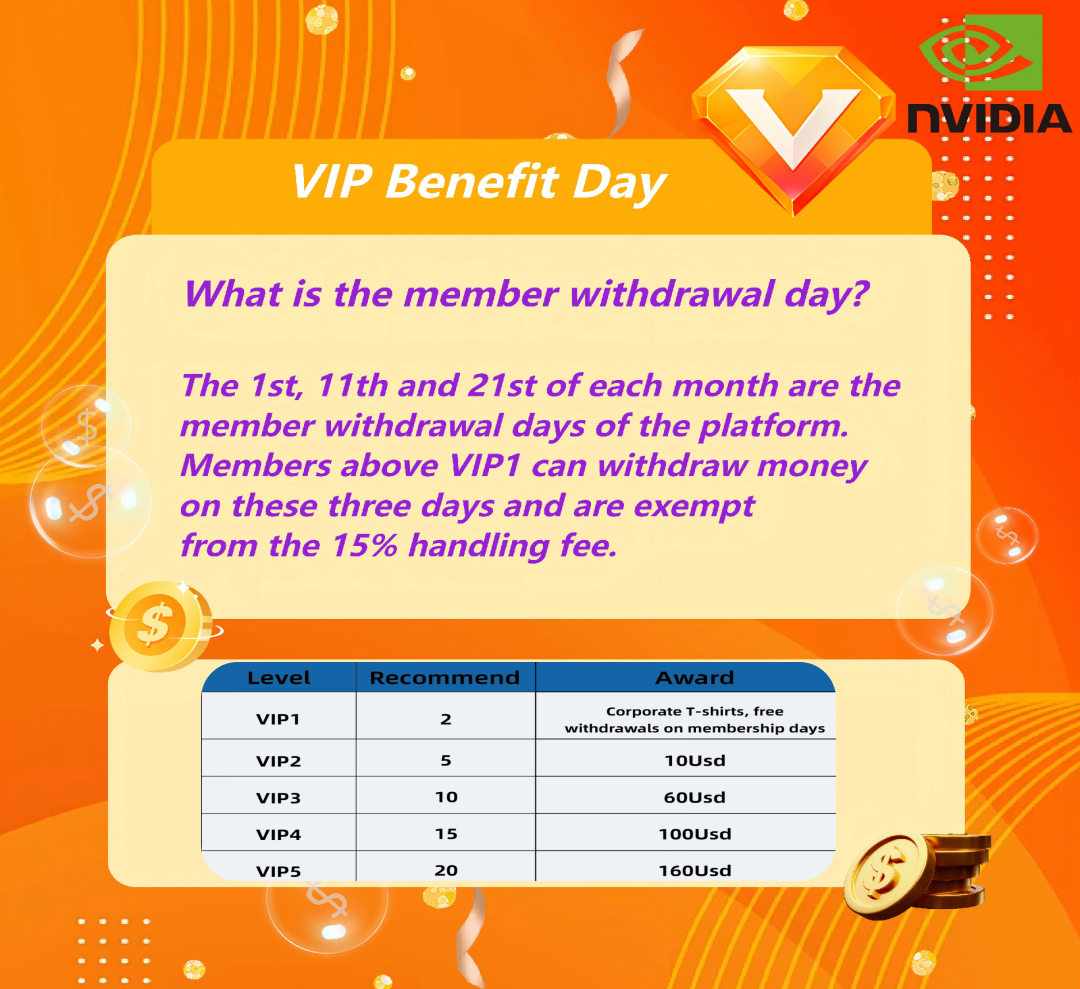 Ngày 1, 11 và 21 hàng tháng là các ngày rút tiền dành cho thành viên của nền tảng. Thành viên từ VIP1 trở lên có thể rút tiền vào ba ngày này và được miễn phí xử lý 15%.