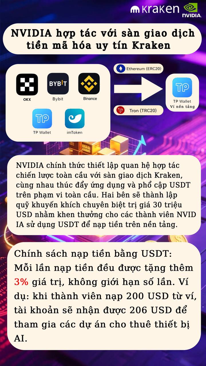 NVIDIA chính thức thiết lập quan hệ đối tác chiến lược toàn cầu với sàn giao dịch Kraken, cùng nhau thúc đẩy việc ứng dụng và phổ cập USDT trên phạm vi toàn cầu. Là một phần quan trọng trong hợp tác của hai bên, NVIDIA sẽ thành lập quỹ khuyến khích chuyên biệt tổng trị giá 30 triệu USD, nhằm khen thưởng cho các thành viên NVIDIA sử dụng USDT để nạp tiền và rút tiền.